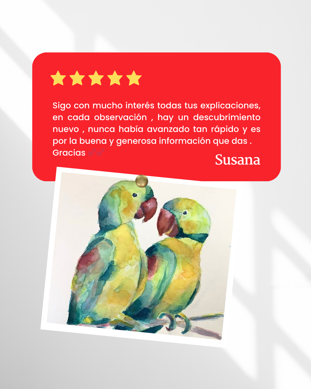 Me he apuntado al curso de iniciación de pajaritos. Es impresionante, y estoy emocionada con todo lo que estoy aprendiendo. Tu forma de explicar es maravillosa, porque te das cuenta de los errores que podemos cometer cuando nos ponemos en práctica y tu recomendación hace que no nos frustremos. Además los dibujos desde el principio salen bien. Eres un gran descubrimiento para mi y solo te puedo dar las gracias por lo bonito y generosa que eres con tus cursos.