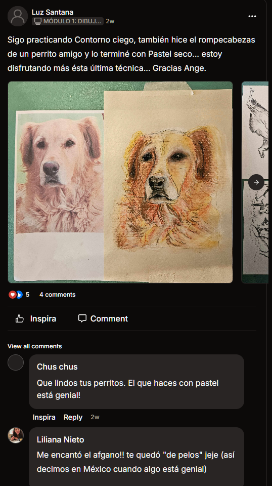 Decenas de artistas como tú ya comparten su progreso dentro de la comunidad. Avanza a la par de otras personas y con la guía de Ange alcanza resultados tangibles en semanas! Mira algo de lo que ya están creando nuestros estudiantes!